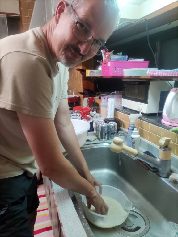 Die Kinder konnten sich nicht vorstellen, dass es eine Küche ohne Reiskocher geben kann. Ich koche ja in uralten Edelstahltöpfen (>50 Jahre, noch älter als ich) auf Ceran. Wobei ich in Japan den Induktionsherd bei den Bekannten schon sehr zu schätzen gewusst habe. Macht halt noch mehr Spaß als Gas. Auf dem zweiten Bild werde ich grade "gemobbed", sprich ich werde beim Reiswaschen überwacht und abgelichtet.