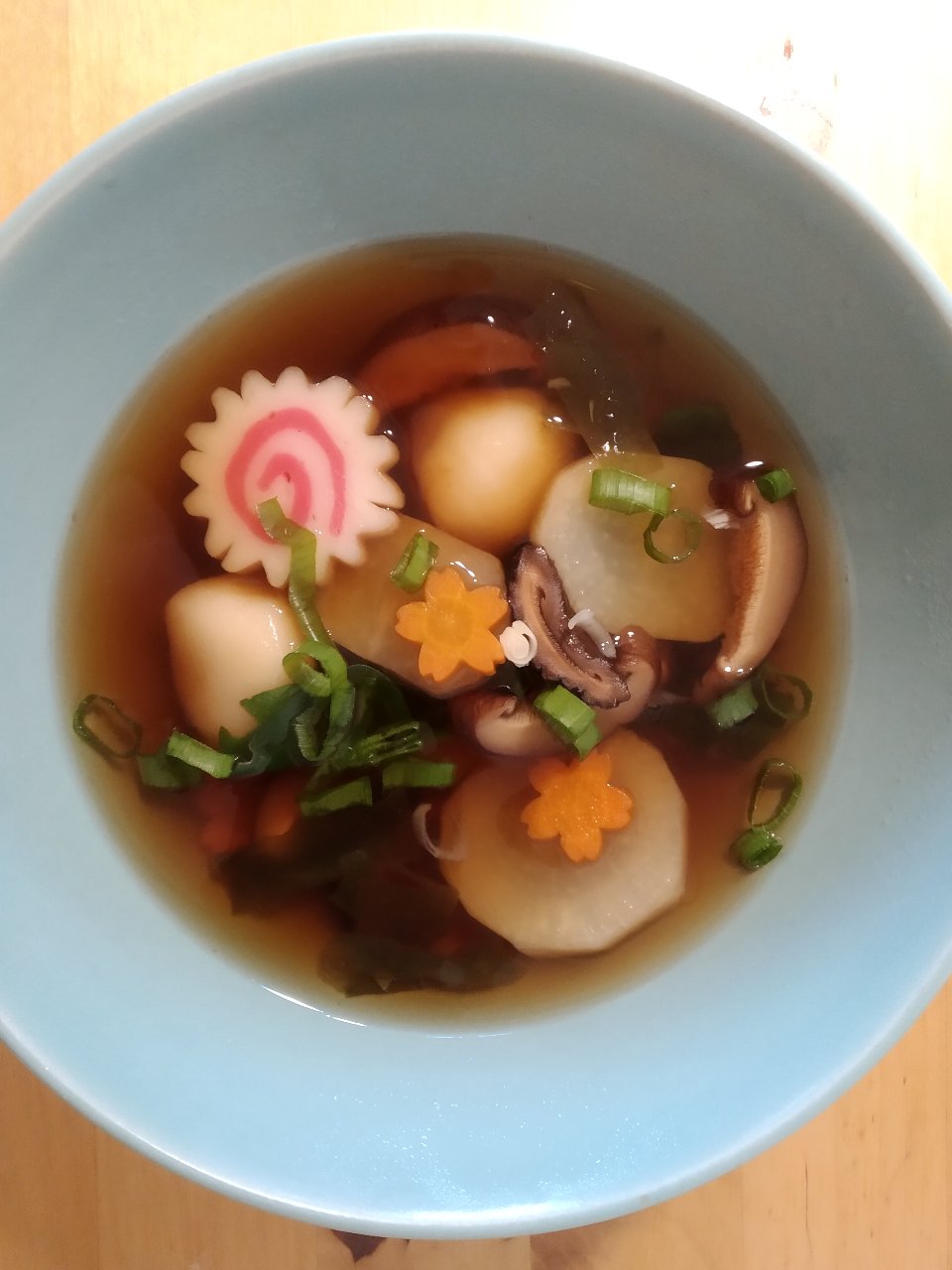 Etwas spät aber doch gab es heute お雑煮 (おぞうに, japanische Neujahrssuppe). Da es hier wohl von Gegend zu Gegend und Familie zu Familie unterschiedliche Rezepte gibt, habe ich einfach genommen, worauf ich Lust hatte.