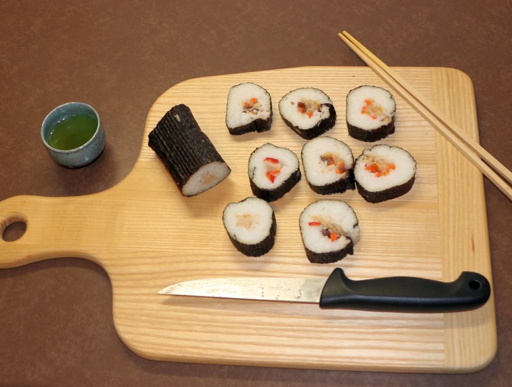 Tja, leider wenig, was Dich ansprechen wird. Obwohl wir hier in Deutschland eigentlich sehr wenig Fleisch essen, arten meine Kochaktionen in Japan meist massiv in Richtung Fleisch aus. Die oben erwähnte Familie ernährt sich sehr klassisch japanisch. Zum Frühstück gibt es Misosuppe und Reis. Es wird viel Fisch gegessen, der oft vom Hausherrn oder seinen Buben nachmittags noch schnell aus dem Meer gezogen wird. Um so exotischer sind dann meine einfachen Kochereien. Ein anderes Problem mit meinen Bildern ist, dass bei den Kochaktionen meist die Kinder mit im Bild sind. Ich muss da noch etwas nacharbeiten.