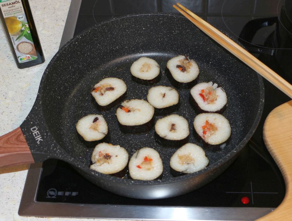Nudeln gut abtropfen und in Sesamöl anbraten. (Zum Trennen der Nudeln nehme ich beim Kochen große Stäbchen, zum normelen Wenden zwei Holzspateln.)