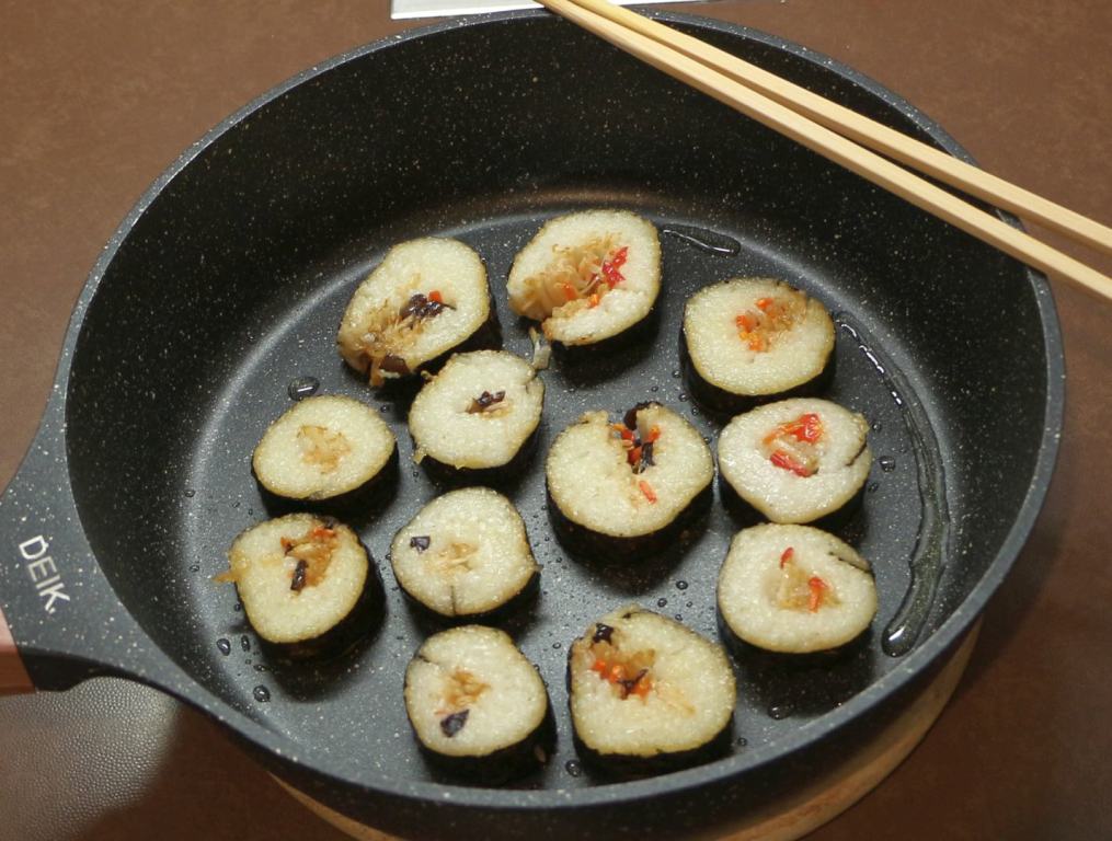 Geräucherten Tofu würfeln und in Sesamöl anbraten.