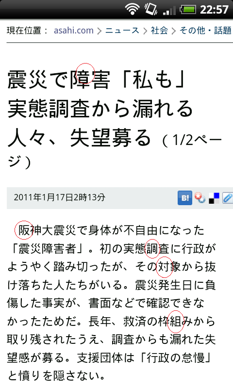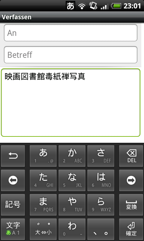 Ich finde übrigens, dass die 9-Tasten-Eingabe von OpenWnn der „PC“-Tastatur überlegen ist. Ich kann mittlerweile wesentlich schneller, und vor allem komfortabler Japanisch mit diesem Hiragana-Modus tippen, als ich das im Querformat mit der breiten Tastatur könnte. Das liegt vor allem daran, dass ich dann nur mit dem Daumen ohne Probleme tippen kann, bei der Querformatsansicht allerdings zwei Finger bräuchte, und dann noch öfters danebentippe. Das passiert mir mit der kleinen Tastatur nicht. Ich würde dir wirklich empfehlen, dich ein wenig daran zu gewöhnen: Wo die einzelnen Konsonanten sind, sieht man ja direkt, und die Vokale (also in welche Richtung man ziehen muss) lassen sich auch ziemlich schnell lernen.