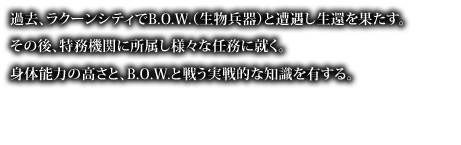 "Traf in Racoon City auf B.O.W (Biowaffe) und überlebte es. Danach trat er/sie dem Geheimdienst bei und erfüllt dort verschiedene Missionen. Er/Sie besitzt hohe körperliche Fähigkeiten und praktisches Wissen im Kampf gegen B.O.W."