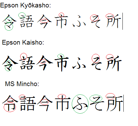 Meiner Meinung nach gut ist grün, schlecht ist rot. Wie du siehst, ist Minchō relativ schlecht, da es nicht so aussieht, wie man es schreibt. Besonders 令 sieht in der Handschrift ganz anders aus, so wie oben. Dafür ist meiner Meinung nach Mincho bei ふ besser. Man kann das gerne komplett in einem Strich schreiben. そ schreibt praktisch niemand so wie es in den drei Schriften zu sehen ist (Da ist mir ein kleiner Fehler eingeschlichen, das untere そ soll auch rot sein).