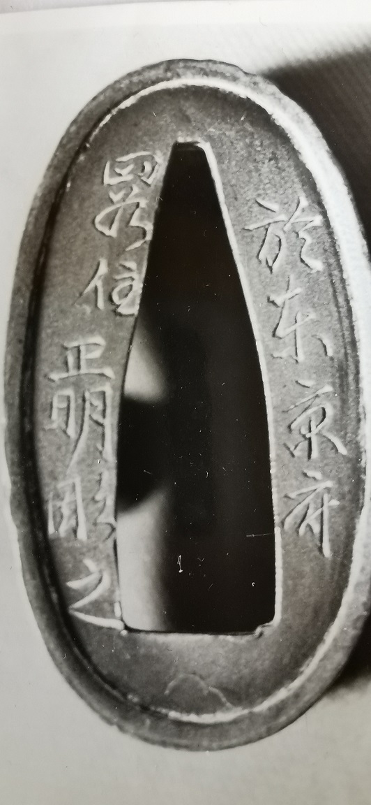 Es geht um einige Schriftzeichen, die in ein Katana eingraviert sind. Die zeichen finden sich einerseits auf der Angel (also dem Griff) und andererseits an der Verschlussstelle zwischen Schwertscheide und Griff..