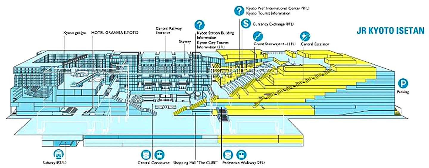 Ach, Pappalapapp. Der Bahnhof in Kyoto ist ein Kleinstadtbahnhof. Das eine oberirdische Gebäude ist architektonisch interesant, aber das Areal und die Übersichtlichkeit ist nichts im Vergleich zu dem, was man z.B. in Umeda (Osaka) sieht.