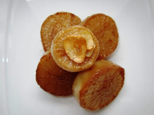 Buta to Daikon no Nimono) oder als Zutat für einen Salat (Daikon Sarada) verwenden, sondern auch braten. Bei dem Gericht Daikon Sutēki handelt es sich um gebratenen Rettich bzw. Rettich Steak. Die bei japanischer häuslicher Küche oft verwendete Kombination von Sojasoße und Butter, die hier als Soße verwendet wird, schmeckt einfach traumhaft. Dazu kommt noch das appetitanregende Aroma des Knoblauchs.