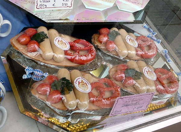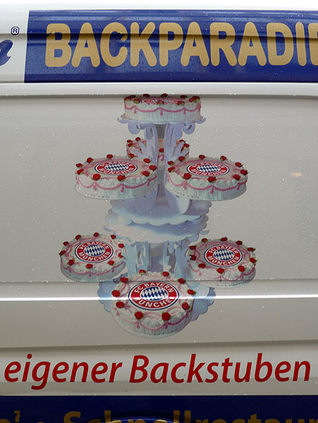Die Fotos in Beitrag #52 zeigen all die Dinge, die Nora brauchte, damit ihr Berliner Weltbild von München Bestand haben konnte: Ein Werbeplakat mit einem bayerischen Volksschauspieler, ein Brotzeitteller aus Marzipan, ein Bäckereilieferwagen mit dem Werbemotiv eines lokalen Fußballvereins und drei Fußballfans in Tracht (man beachte die schwarz-rot-goldenen Socken)