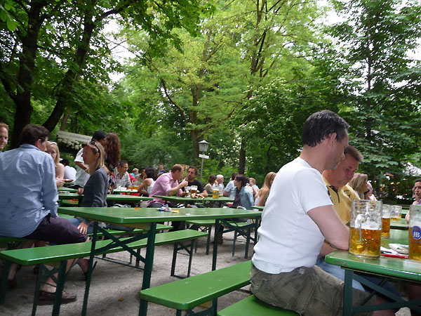 Aber jetzt zurück zum Ernst und zu unserem Treffen, daß wirklich von sehr viel Fröhlichkeit (und Bier) gekennzeichnet war. Unsere erste, noch inoffizielle Station für Nicht-Bayern war ein Biergarten, wo man mich unwissentlich zu meinem ersten Public Viewing schleuste. Dabei hatte ich mir geschworen, so etwas nie mitzumachen! Ein paar Tage später wurde mir klar, wie hoffnungslos dieses Vorhaben ohnehin war: In nahezu jeder Lokalität in München steht ein Fernseher und man entkommt dem Fußball nicht. Rückzugsgebiete sind dann nur die Pinakotheken, in die die Münchner, wie man munkelt, ohnehin nicht gehen. zwinker