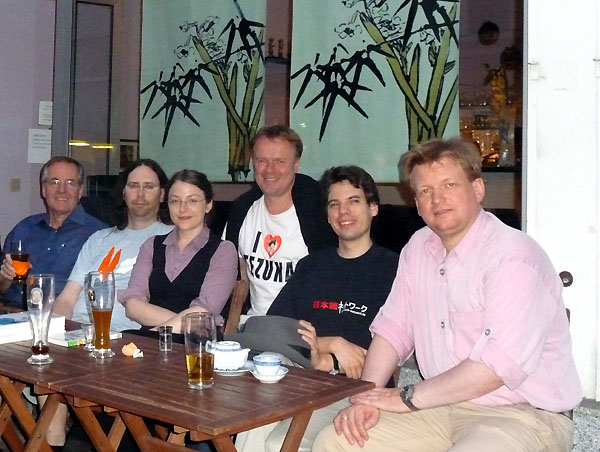 Noras Post #53: Der Biergarten am Chinesischen Turm im Englischen Garten. Der erste Treffpunkt, da er atomu bekannt war. Ein großer Biergarten mit dem von Nora gefürchteten Public Viewing. Hier trafen sich atomu, sein Bekannter Jürgen aus Tokyo, Shino, Nora und ich. Um den Schock von Biergarten und Public Viewing etwas zu mildern überreicht meine Wenigkeit unserer Forumsgründern im zweiten Bild eine Riesenbreze (wir hatten Glück, sie kamen gerade frisch aus dem Ofen). Das dritte Bild zeigt rechts atomu und links Jürgen, beide unter dem Einfluss von Fußballübetragung und Vuvuzela-Beschallung (von nichts anderem). Weiter mit Beitrag #56: Bevor uns Fußball und Kastanien komplett in ihren Bann schlagen konnten zogen wir um ins Tai Thai, einem kleinen Restaurant in Maxvorstadt (nahe der Uni). Hier stießen Sec (im ersten Bild rechts) und samidare als Überraschungsgast zu uns. Das kleine Restaurant - extra für uns geöffnet - hatte durchaus auch Essen zu bieten, auch wenn das zweite Bild anderes vermuten lässt (hier wurde Nora mit dem vermeintlich widersprüchlichen dunklen Weißbier vertraut gemacht, ein Widerspruch, der sich nach Genuss mehrerer Halben in Nichts auflöst. Shino lernte hier zu seiner Erleichterung, dass wir Südländer so babarische Erfindungen wie das Kristallweizen nicht kennen. Weißbier enthält Hefe, Punkt). Im dritten Bild zeigt sich unsere Forumsbehüterin wohlbehutet und das vierte Bild ist das langerwartete Gruppenfoto (v.l.n.r.: samidare, Sec, Nora, atomu, Ma-kun, Jürgen; nicht im Bild: Shino). Tja... und dann kam eben der Nieselregen: Glücklicherweise hatten wir diesen lauschigen Abend ausgenutzt, denn er sollte der letzte in dieser Woche sein. Wir machten noch ein wenig die Straßen Schwabings unsicher, bis wir in der Chocolaterie im letzten Photo niedergingen, wo wir uns mit mit diversen Schweinereien den Regen versüßen ließen.