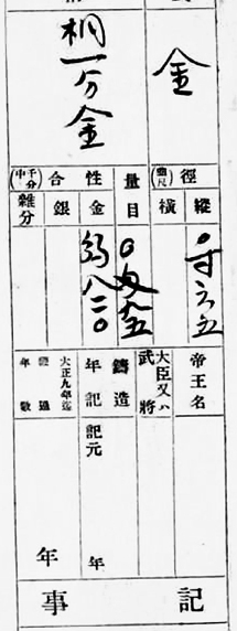 Nochwas, man kann erkennen, daß der Autor der Handschrift vor 1900 zur Schule gegangen ist (wg. Rechtschreibreform). Da die Japaner ihre Rechtschreibreformen mit einer ziemlichen Straffheit vollzogen, kann man wohl annehmen, daß diese Münze vor hundert Jahren schon ein Sammlerstück gewesen ist.