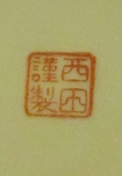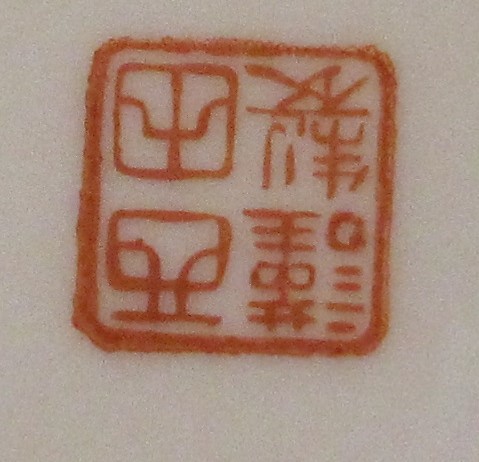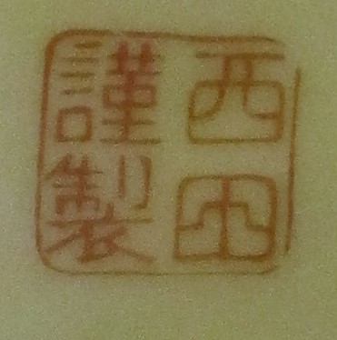 Ich habe wieder eine Porzelan Marke. Die beiden untern Schriftzeichen wurden hier schon eimal übersetzt. "Das obere Kanji könnte wohl auch alleinstehend ein japanischer Nachname sein ("Kado")" Kann mir bitte die Marke übersetzen.