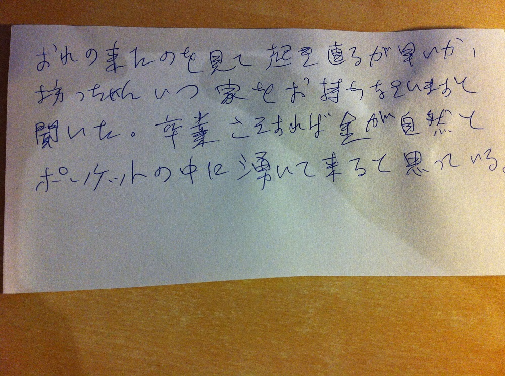 @Yamada: Das "、" schreiben aber auch 外人s, das lernt man ja und guckt sich das ab. Die Formulierung kann er ebenfalls irgendwo gelesen und übernommen haben. Oder jemanden gefragt haben. Vielleicht hat auch ein Japaner alles diktiert oder vorgeschrieben. Der Inhalt sagt nun nichts darüber aus, es geht nur um die Schrift.