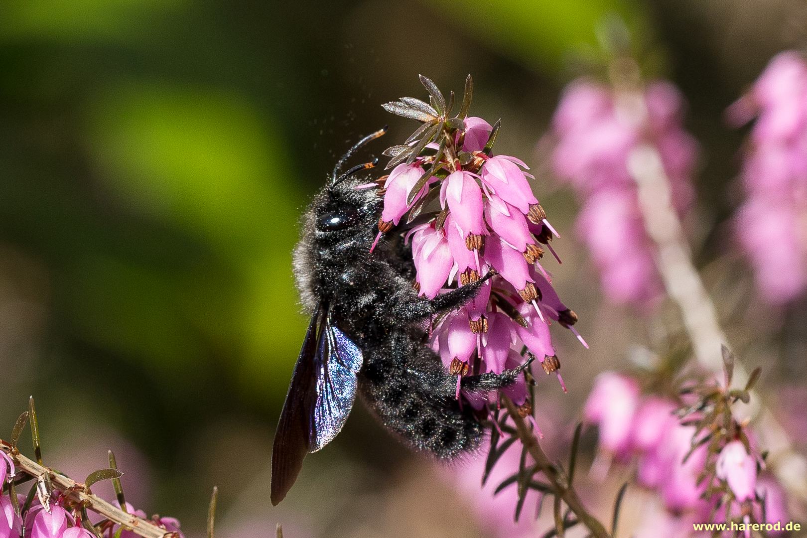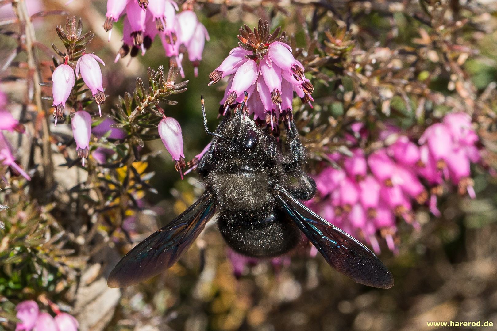 Bei wunderschönem Frühlingswetter wurden unsere Erikablüten von vielen Bienen besucht, unter anderem eben von unser einheimischen Xylocopa iris. An Arbeiten war erstmal nicht zu denken und ich habe eine Reihe von Makroaufnahmen gemacht. Wie Honigbienen auch, sind unsere Holzbienen bei schönem Wetter sehr entspannt und lassen sich auch mal auf die Hand nehmen.