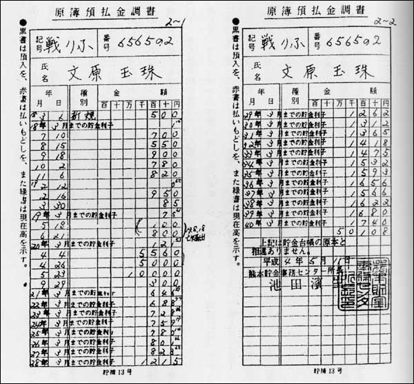 Im Jahr 1994 hat eine Koreanerin( sie hießt 文玉珠、문옥주, ihr japanischer Name lautete 文原玉珠) vor japanischen Gericht gefordert, um ihr Geld, die als Prostituierte (wie Sie erläutert haben, als "Sexsklavin") verdient hat, zurückzukriegen. Der Anhang ist ihre Kontostandbescheinigung jener Zeit und 文玉珠、문옥주 hat zugestimmt, dass diese Bescheinigung zu ihr gehört.
