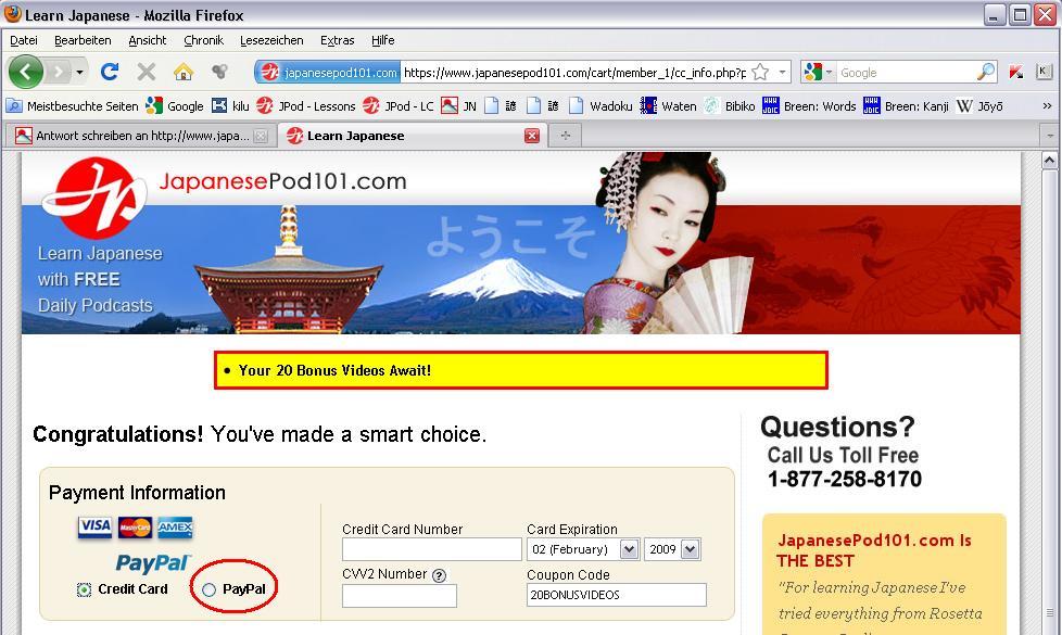 Wenn du hier die PayPal-Option auswählst, dann sendet JPod101 bzw. der Anbieter die Zahlungsdaten an dein Konto bei PayPal. Damit die Transaktion bei dem richtigen Konto ankommt, musst du natürlich auch die E-Mail-Adresse verwenden, die du bei PayPal hinterlegt hast. PayPal übernimmt dann den Rest der Transaktion. Wenn du nur Kontodaten angegeben hast, dann kann es einige Tage dauern, bis die Zahlung bei JPod101 oder dem jeweiligen Anbieter eingegangen ist.