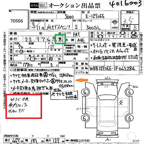 Das grün markierte Feld ist der Inspektors report. Der letzte Punkt wo das AW auftaucht, dürfte Kratzer an einer oder mehreren Felgen bedeuten (AW steht für Alloy wheel).